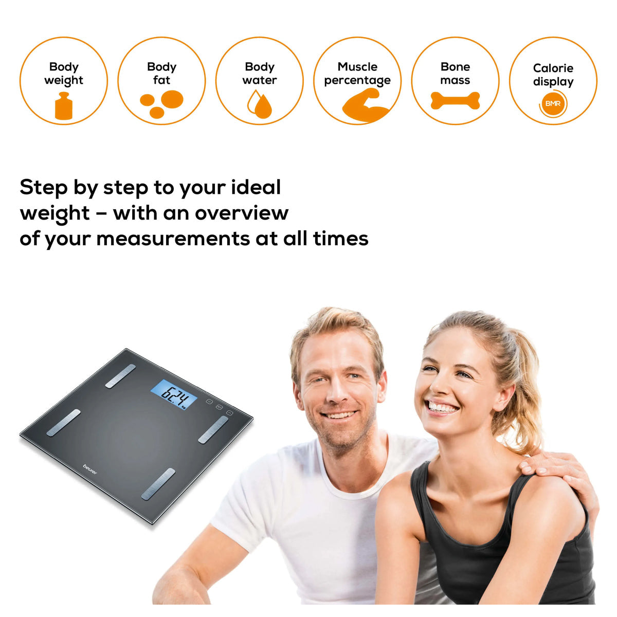 • Weight, body fat, body water, muscle percentage, bone mass and BMR calorie display