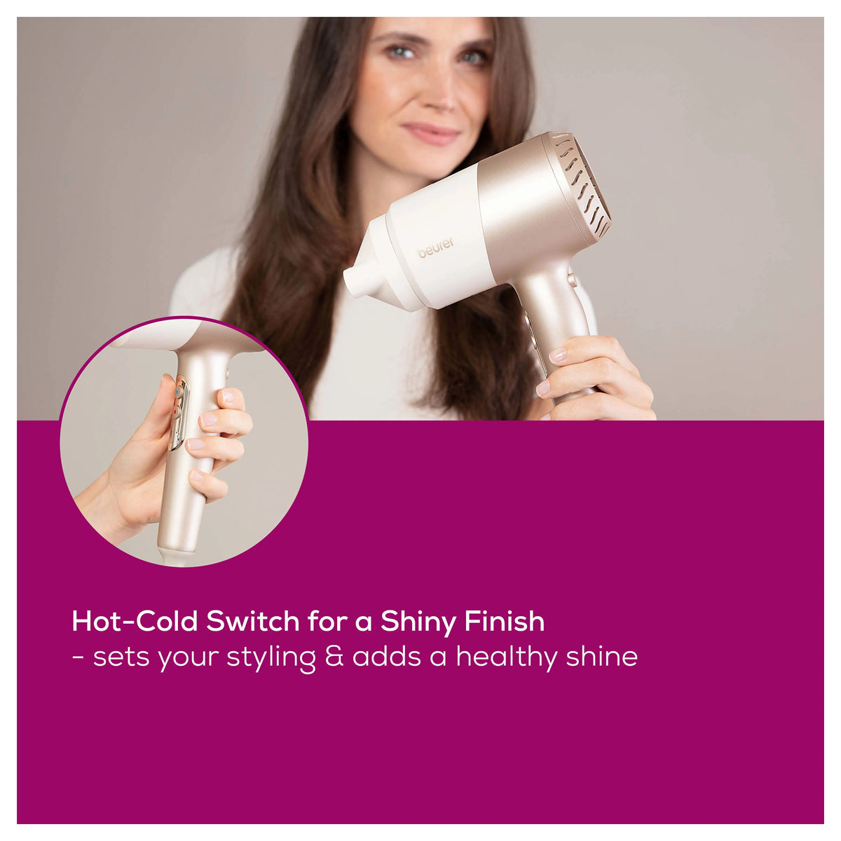 Beurer Hair Dryer Compact HC 40 is designed for effortless styling. Its slim professional nozzle ensures precise results, while the alternating hot/cold mode enhances shine and the cool shot locks in styles. With three heat and airflow settings, overheat protection, and a removable safety filter, it adapts to every hair type while ensuring safety and easy maintenance. Convenient storage options include a hanging loop or travel bag, making it perfect for professional styling anywhere, anytime.