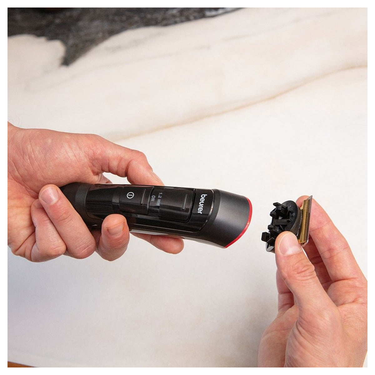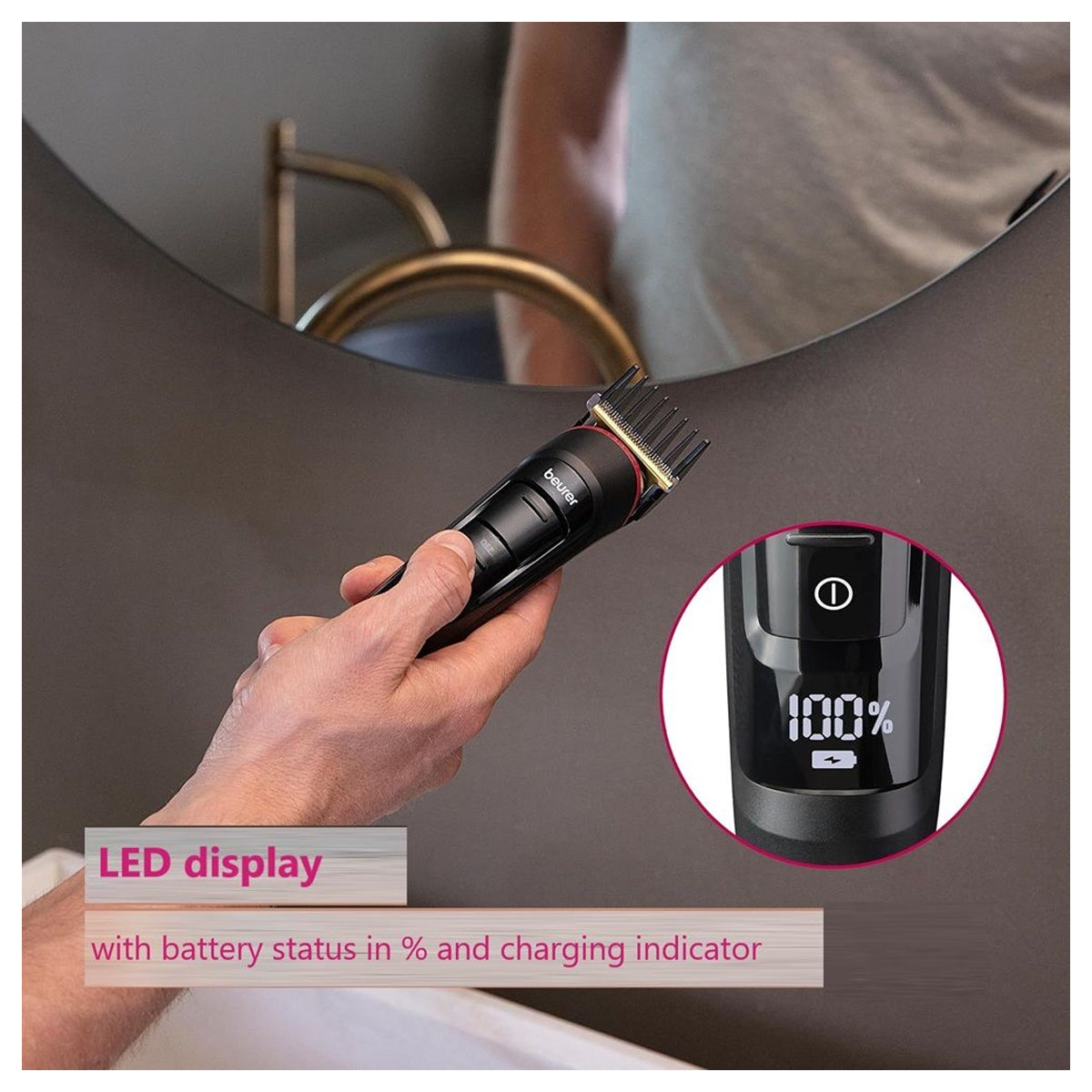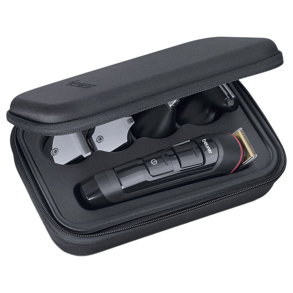 Beurer Multigroomer - MN9X is designed to give you complete grooming convenience.It comes with 11 versatile accessories for trimming and shaving beard, hair, nose, ears, and body. Equipped with high-quality stainless steel blades, it ensures precise and gentle hair removal. The waterproof (IPX7) design makes it safe for shower use, while the ergonomic build offers easy handling. With a powerful lithium battery, enjoy up to 90 minutes of cordless use on a single 90-minute charge, tracked with an LED display showing battery status and charging progress. A black storage bag, cleaning brush, and oil are included for practical upkeep.