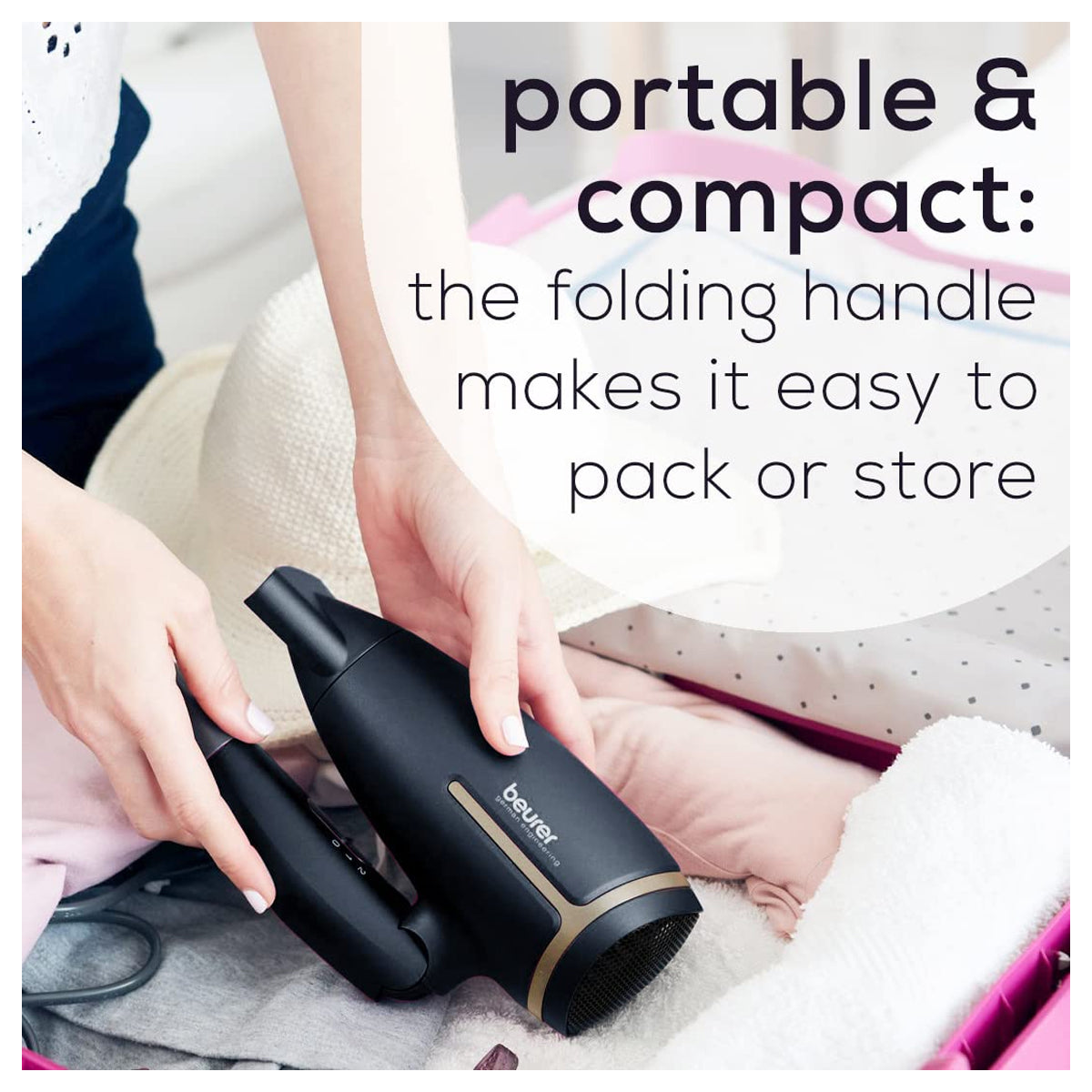 Beurer Travel Hair Dryer - HC25 is designed to deliver salon-quality results at home or on the go. Featuring advanced ionic technology, it reduces frizz, seals the hair cuticle, and enhances natural shine for healthier-looking hair.
