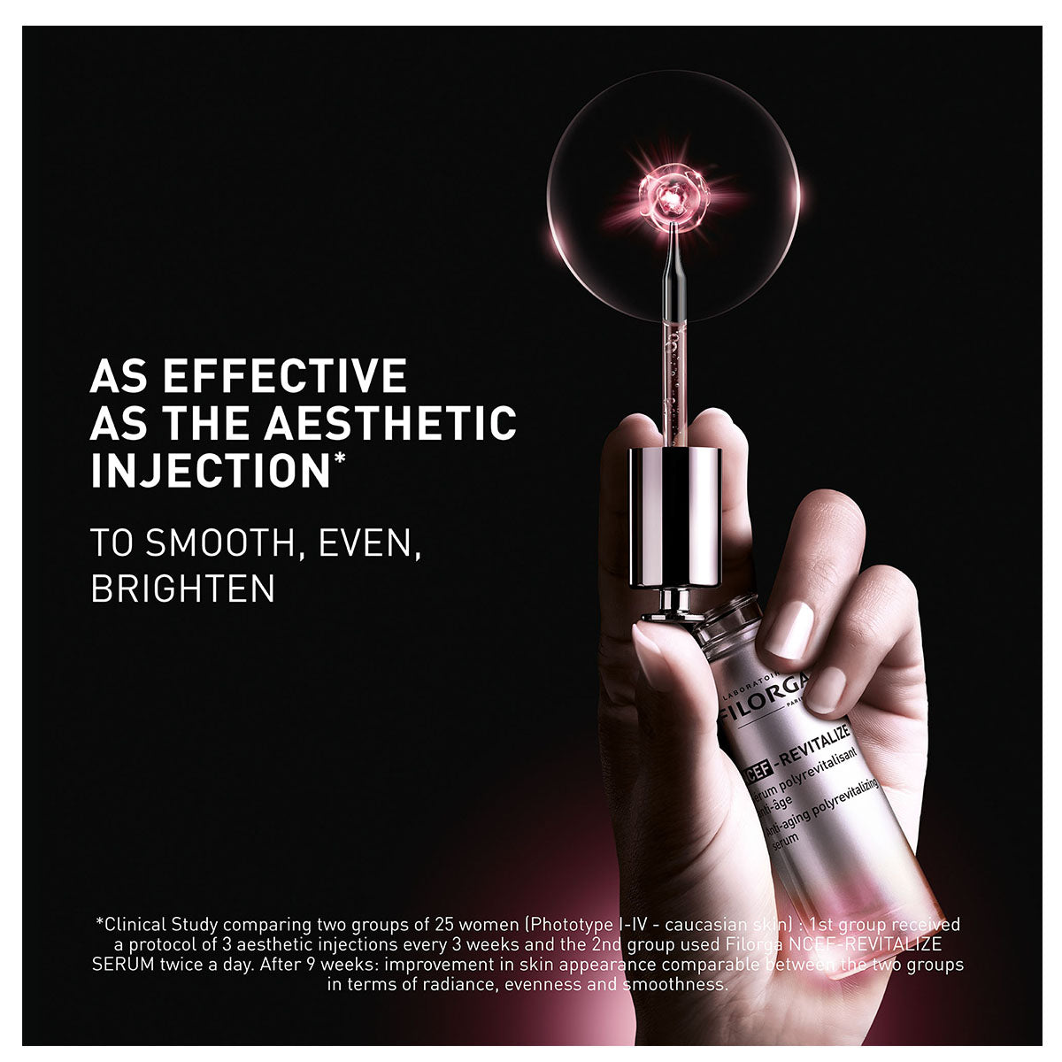 - This rejuvenating serum is highly concentrated in NCEF, a unique complex developed exclusively by Filorga and inspired by revitalising anti-ageing injections. It combines 10 carefully selected essential ingredients (vitamins, amino acids, co-enzymes, etc.) to improve collagen and elastin production, while also boosting antioxidant protection and the skin barrier. Thanks to new encapsulation technology that allows active ingredients to penetrate the skin more effectively (1), they are able to take effect deep below the epidermis.