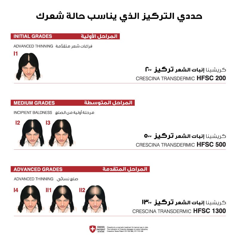 • CRESCINA ® HFSC ist in drei Stufen erhältlich, die jeweils für den jeweiligen Haarausfall geeignet sind: Stufe 200 für den ersten Grad von Haarausfall, Stufe 500 für mittleren Haarausfall und 1300 für fortgeschrittenen Haarausfall.
