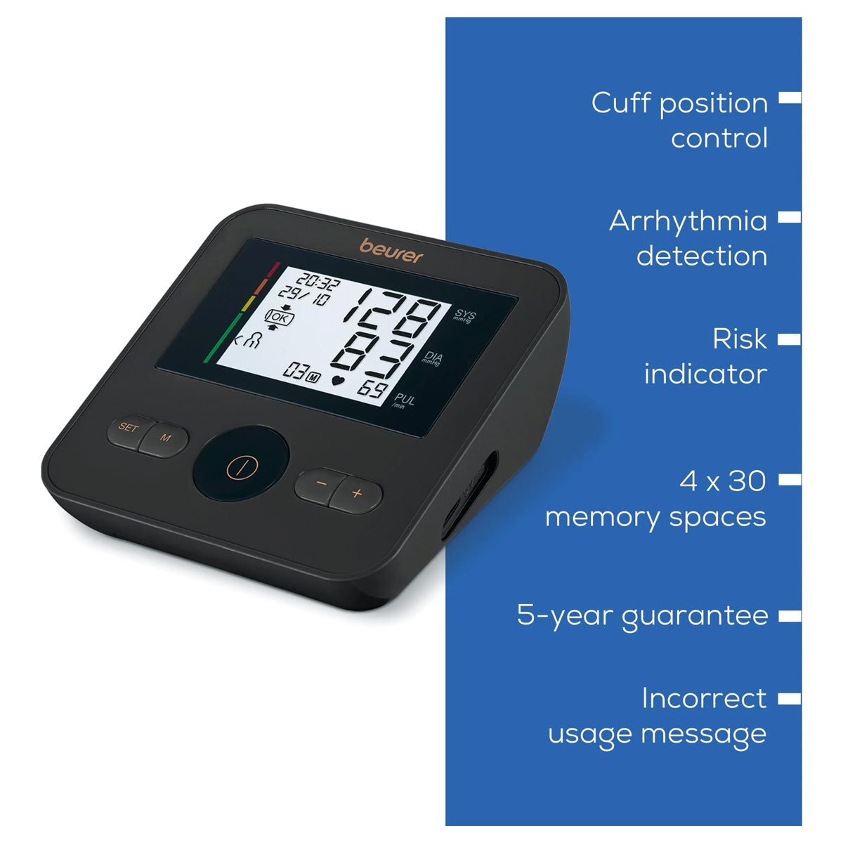 Beurer Upper Arm Blood - BM 27+ Limited Edition is designed for accurate, simple, and reliable home monitoring. This fully automatic device measures systolic and diastolic blood pressure as well as heart rate, and features arrhythmia detection to warn of possible irregular heart rhythms.