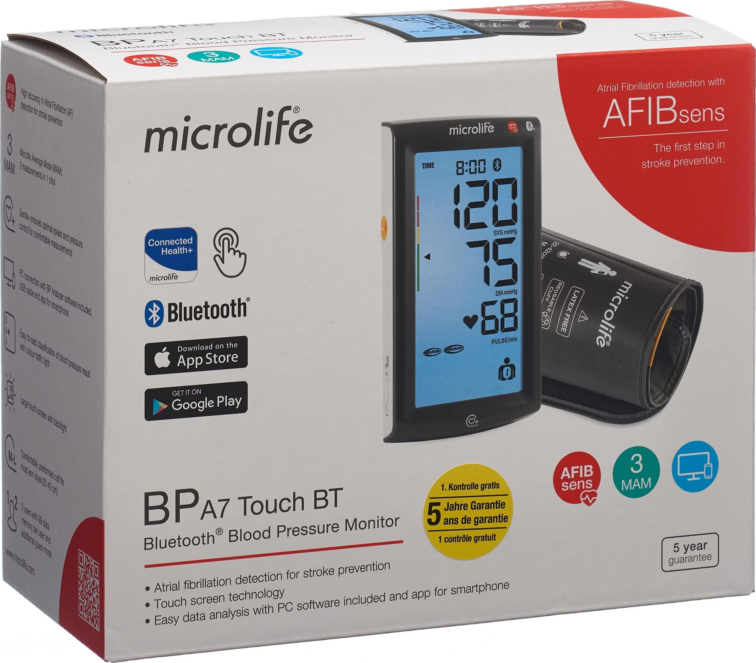Das Microlife BP A7 Touch BT ist ein klinisch validiertes, automatisches Oberarm-Blutdruckmessgerät mit großem Touchscreen-Display , Bluetooth®-Konnektivität und fortschrittlicher Vorhofflimmer-Screening-Technologie. Es ermöglicht Anwendern die bequeme Überwachung von Blutdruck- und Pulswerten zu Hause und erfüllt dabei medizinische Messstandards.