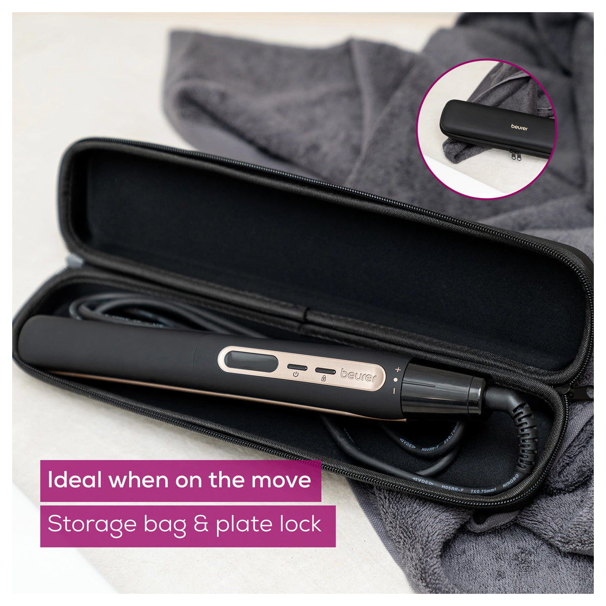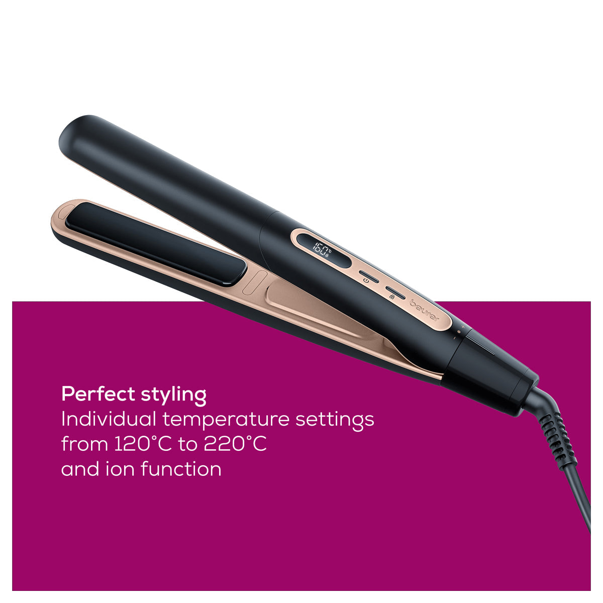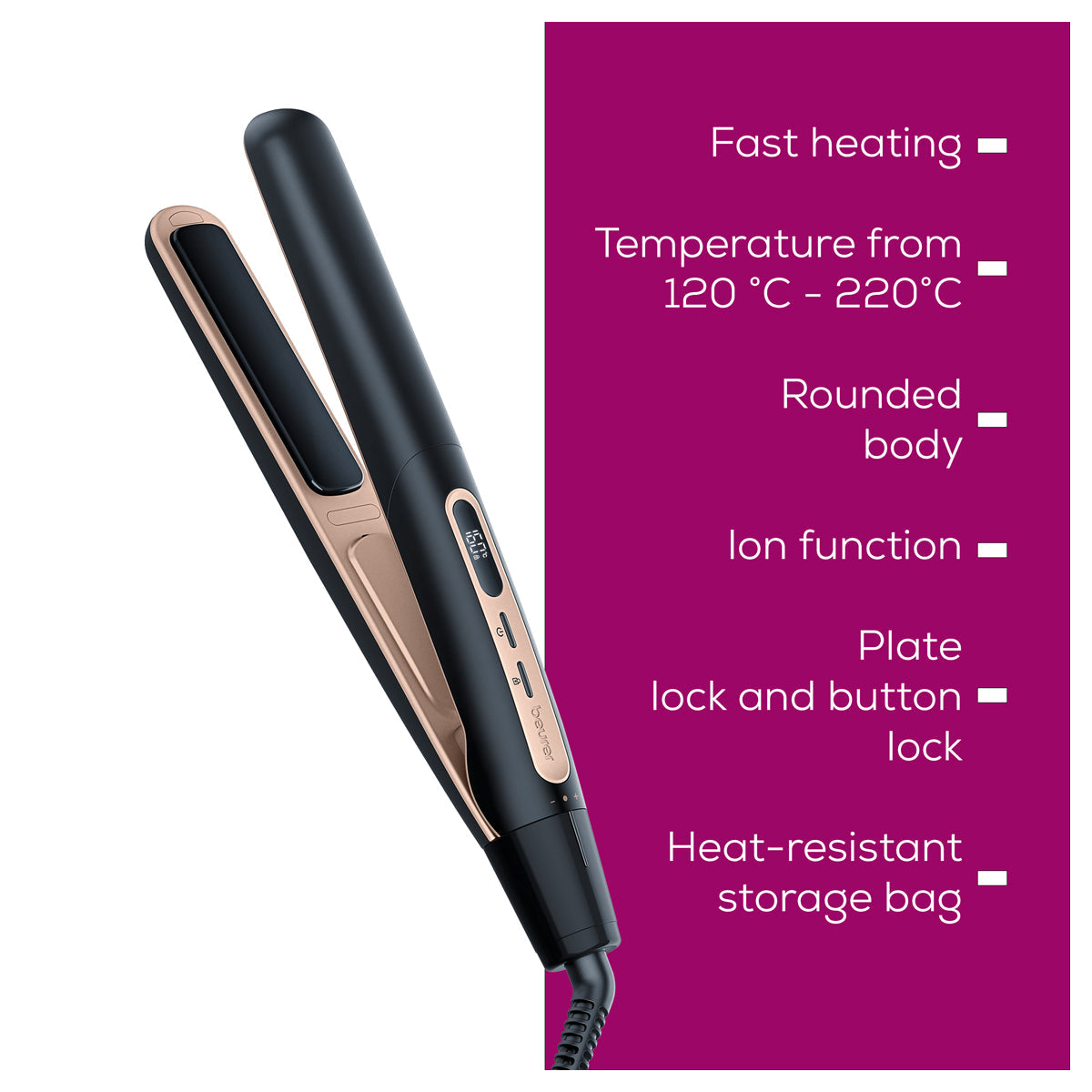 Plancha de pelo Beurer HS 100 Con función iónica, está listo para usar en solo 12 segundos. Gracias a su carcasa redondeada, no solo podrás alisar tu cabello, sino también crear hermosas ondas.